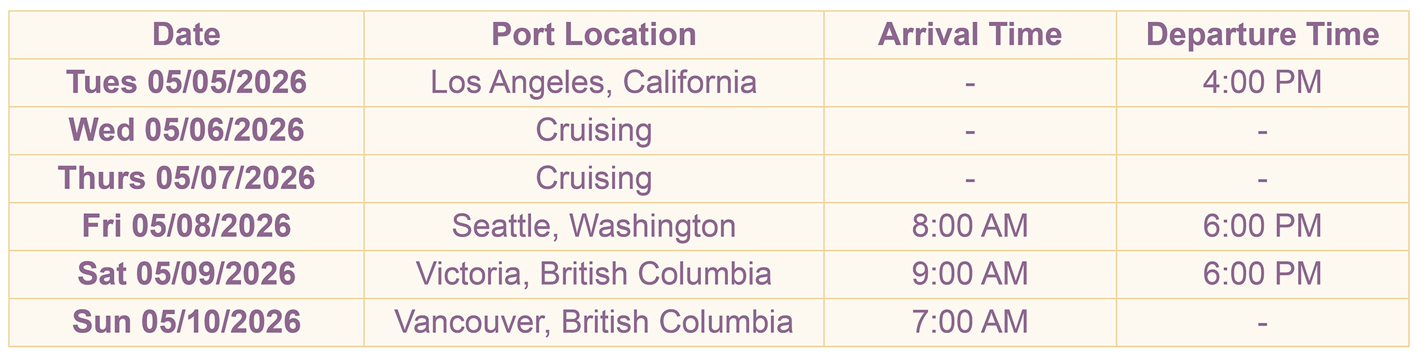 Join us for an unforgettable cruise up the Pacific Coast aboard the magnificent Royal Caribbean Serenade of the Seas from Tuesday May 5, 2026 through Sunday May 10, 2026. Immerse yourself in the natural beauty of the Pacific Coast while enjoying gourmet cuisine or relaxing by the pool. Visit Seattle’s Space Needle for a 360º view of the city, explore historic landmarks in Victoria, BC, and enjoy the picturesque Butchart Gardens in Vancouver.